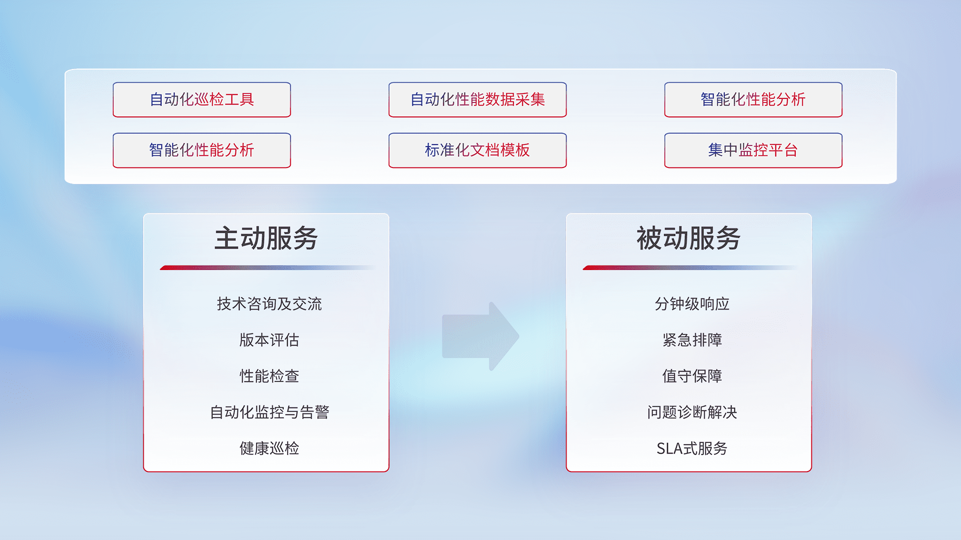 智能化工具和标准化文档,,,,保障服务质量,,提供主动服务(包含技术咨询、、版本评估、、、、性能检查、、自动化监控与告警、、健康巡检)和被动服务包含(分钟级响应、、、、紧急排障、、、、值守保障、、、、问题诊断解决、、、SLA服务)。。。。